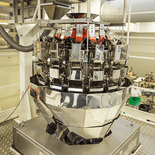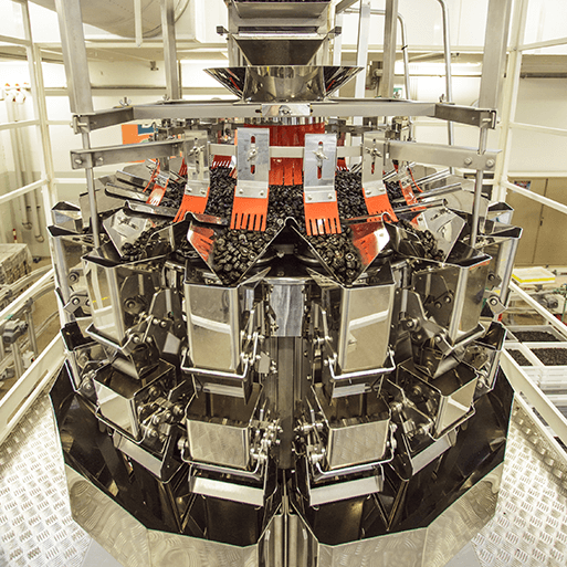 The 16 head Ishida model is operating in twin mode, with two sets of eight heads weighing the product simultaneously, which effectively doubles output from a single weigher. A set of booster hoppers situated beneath the weigh hoppers increases the number of weighments from which the combination closest to target weight is selected, thereby further increasing accuracy. A special rotary distribution system underneath the weigher then fills the cartons.