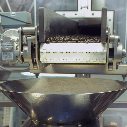 Acting as a transfer device the cups are then taken to the filling station. The cartons are automatically assembled and the cups pass over them, gradually depositing the pastilles. After filling, the cartons are closed and glued, and transferred to a shrink wrapper before being placed into cardboard outers for onward despatch.