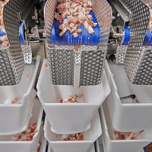 Les résultats ne se font pas attendre : la ligne automatisée traite à ce jour 1 million de barquettes/an. Principalement utilisée pour conditionner en barquettes de 150 g de lardons fumés ou nature découpés en dés ou en allumettes, elle ne requiert que 2 opérateurs. Le premier livre les lardons sur la plateforme et le second les dirige vers la première rangée de bennes de ravitaillement. Le logiciel pèse le contenu de chaque benne puis procède à un calcul extrêmement rapide permettant, par l’association d’une partie du contenu de chaque benne, d’obtenir l’exact poids cible. Les doses sont ensuite déposées dans des barquettes manuellement positionnées sur un convoyeur pour être enfin operculées - avec une DLC de 28 jours- et acheminées vers un détecteur de métaux.